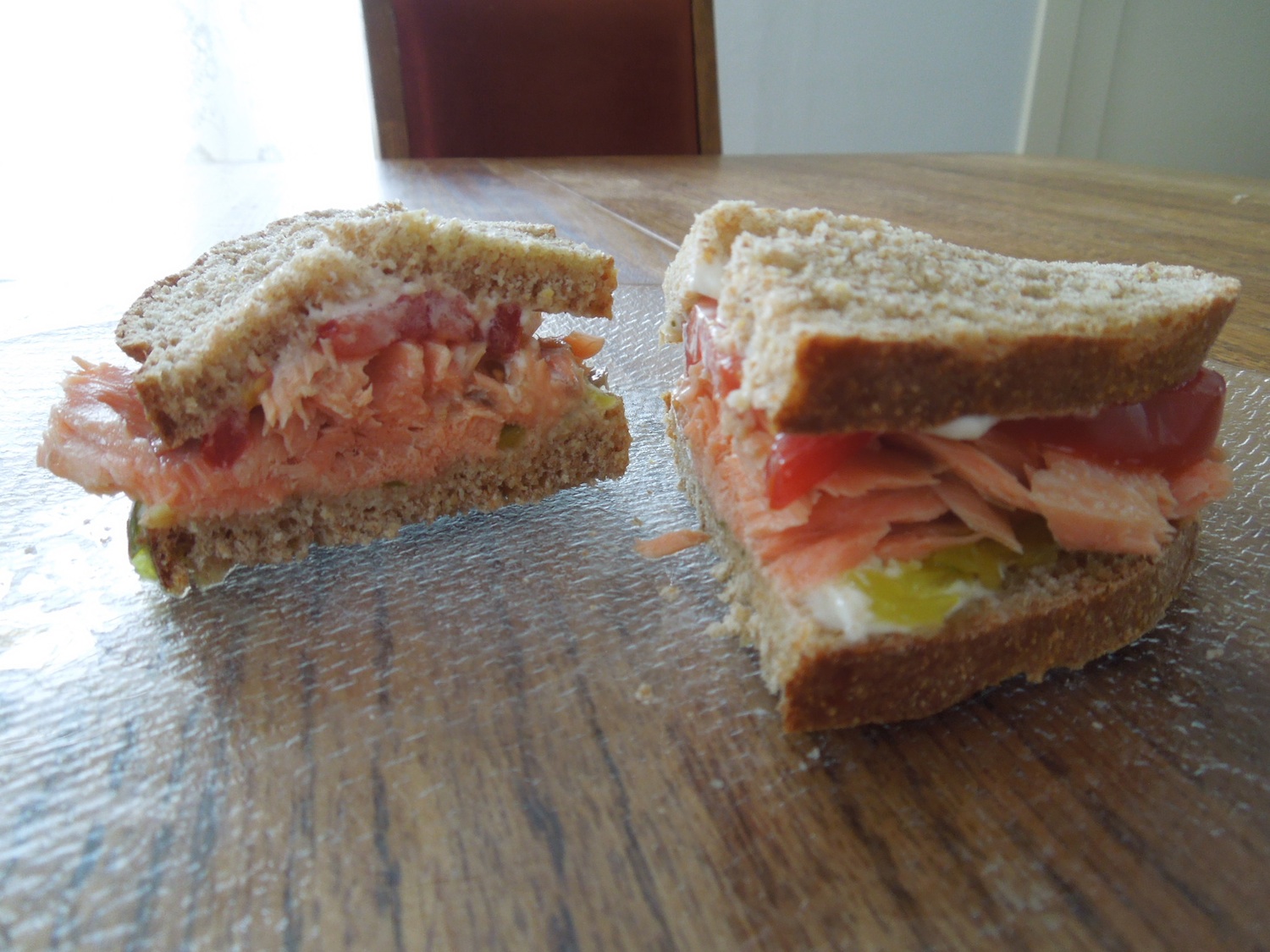 My day started early, as all Mondays do, and I am ready to build a sandwich with some of our leftover Naknek River King Salmon and lightly toasted homemade bread that our friend Sarah brought us the other night. Some mayo, sweet relish, and sliced tomatoes are all that is needed to make it delightful.